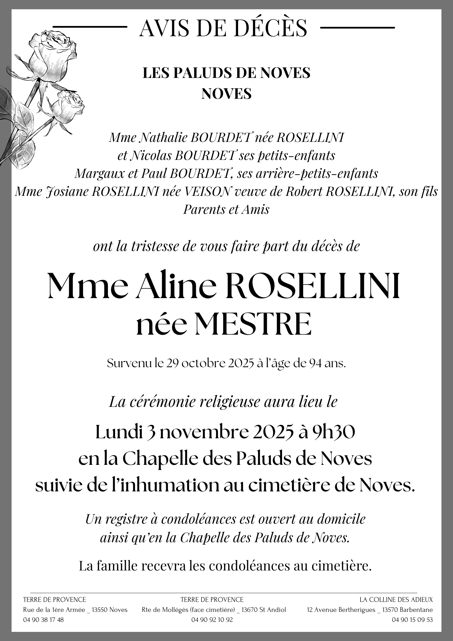 C’est avec une grande tristesse que nous vous annonçons le décès d’Aline ROSELLINI survenu le mercredi 29 octobre 2025. La cérémonie se déroulera le lundi 03 novembre 2025 à 09h30 en la Chapelle du Sacré Coeur des Paluds de Noves suivie de l'inhumation au Cimetière de Noves.
