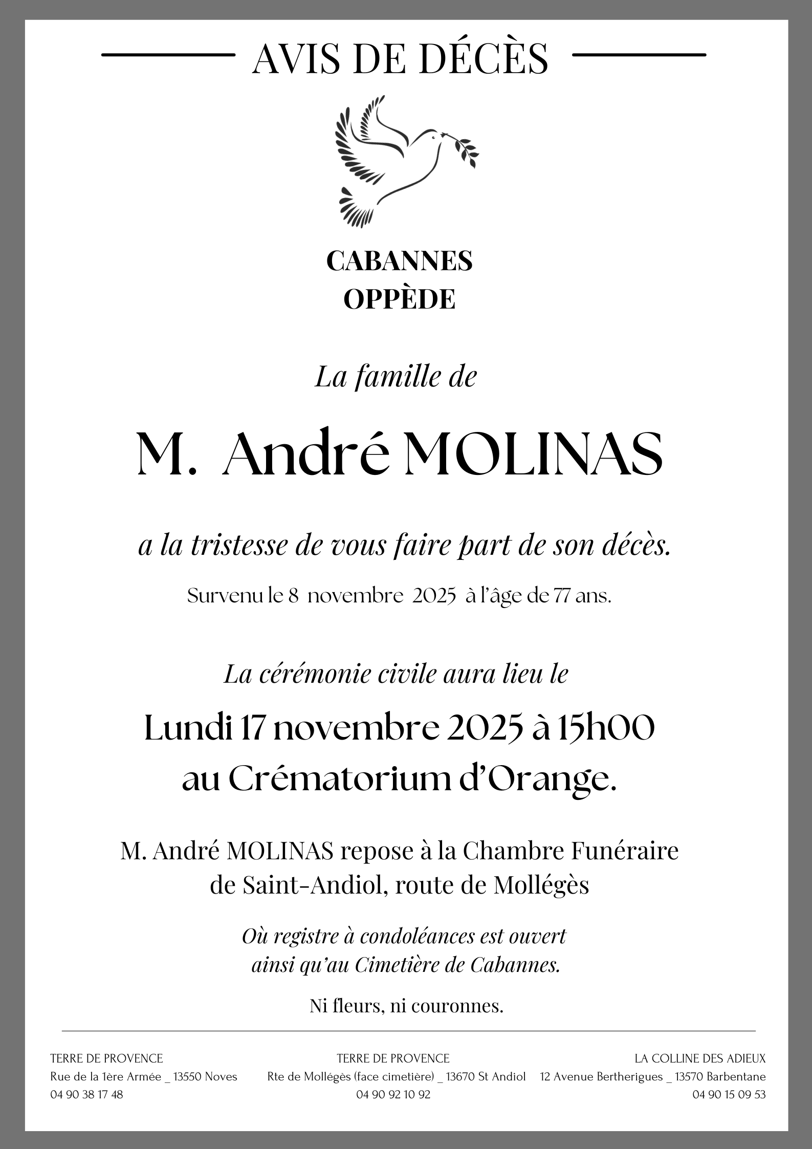 C’est avec une grande tristesse que nous vous annonçons le décès d’André MOLINAS survenu le samedi 08 novembre 2025 à Marseille. La cérémonie se déroulera le lundi 17 novembre 2025 à 15h00 à l’adresse suivante : Crématorium d'Orange - 933 Rue des Chênes Verts - 84100 Orange.