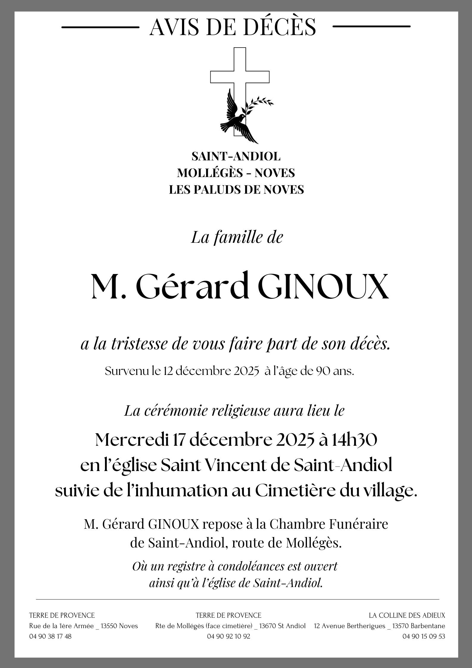 C’est avec une grande tristesse que nous vous annonçons le décès de Gérard GINOUX survenu le vendredi 12 décembre 2025 à Avignon. La cérémonie se déroulera le mercredi 17 décembre 2025 à 14h30 à l’adresse suivante : Église Saint-Vincent - 13670 Saint-Andiol.
