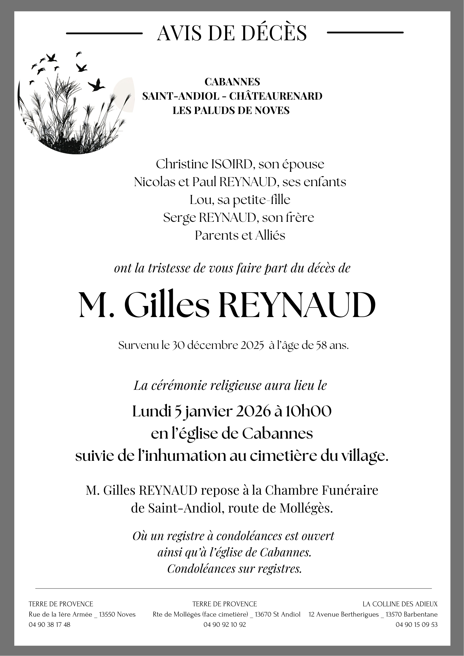 C’est avec une grande tristesse que nous vous annonçons le décès de Gilles REYNAUD survenu le mardi 30 décembre 2025 à Marseille.