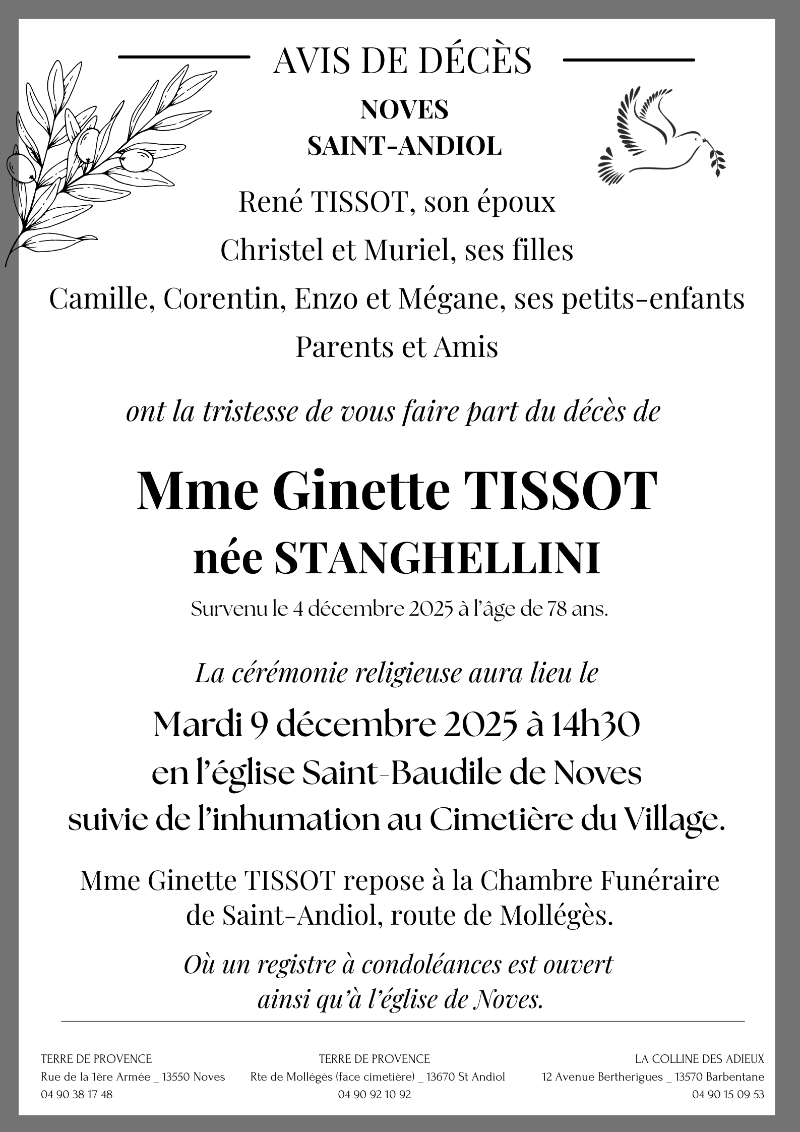 C’est avec une grande tristesse que nous vous annonçons le décès de Ginette TISSOT survenu le jeudi 04 décembre 2025 à l'âge de 78 ans.