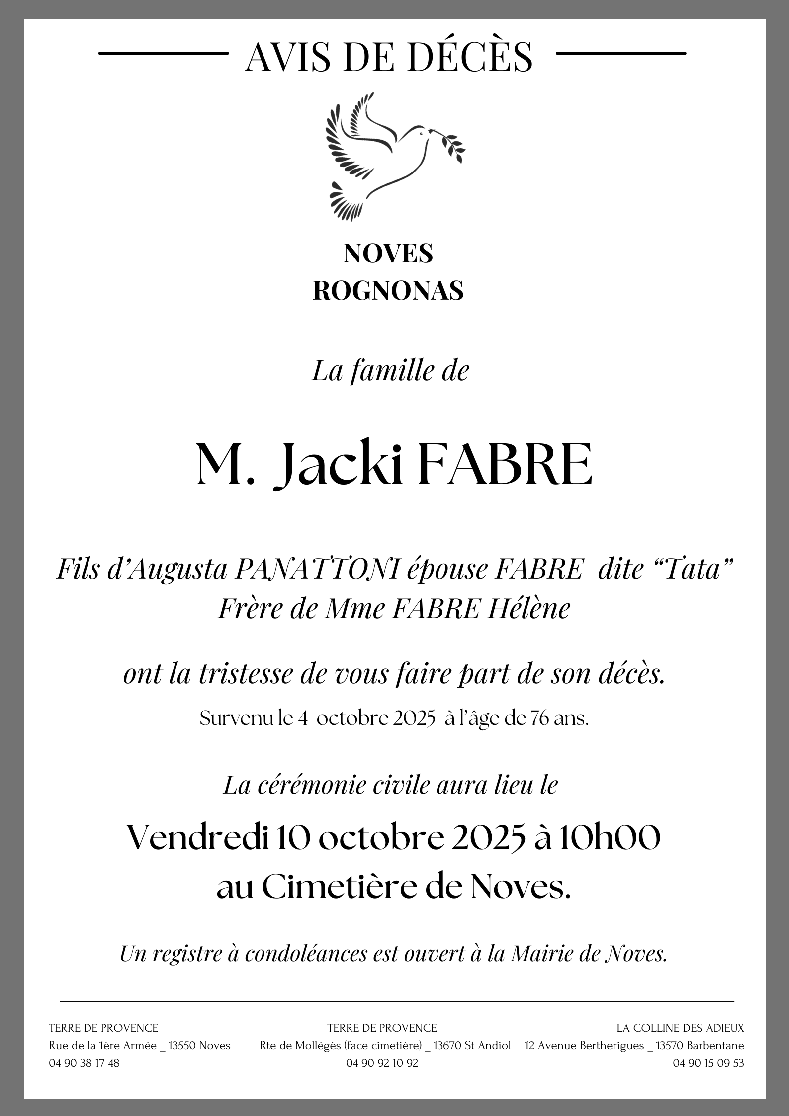 C’est avec une grande tristesse que nous vous annonçons le décès de Jacki FABRE survenu le samedi 04 octobre 2025 à Avignon.