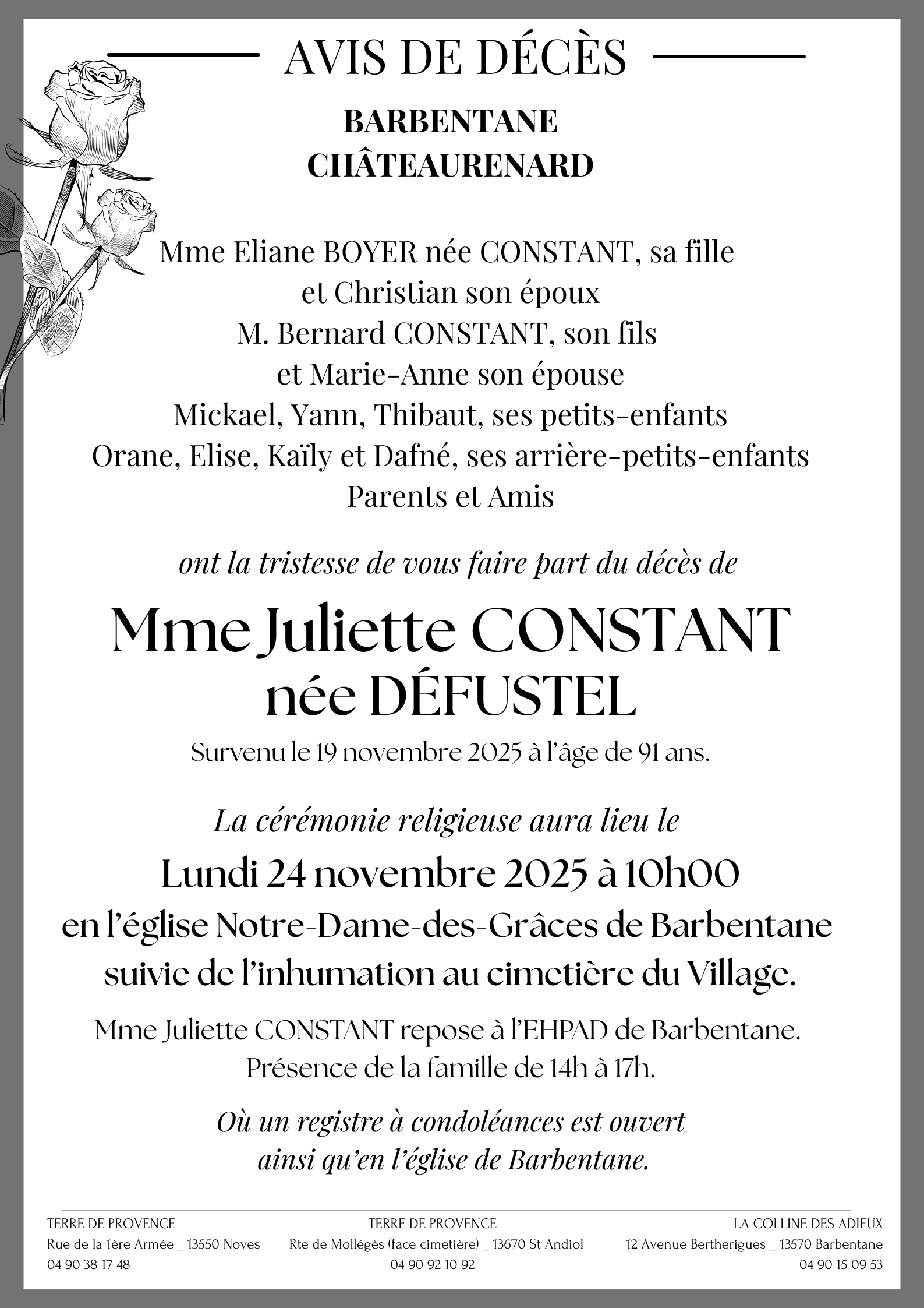 C’est avec une grande tristesse que nous vous annonçons le décès de Juliette CONSTANT survenu le mercredi 19 novembre 2025 à Barbentane.