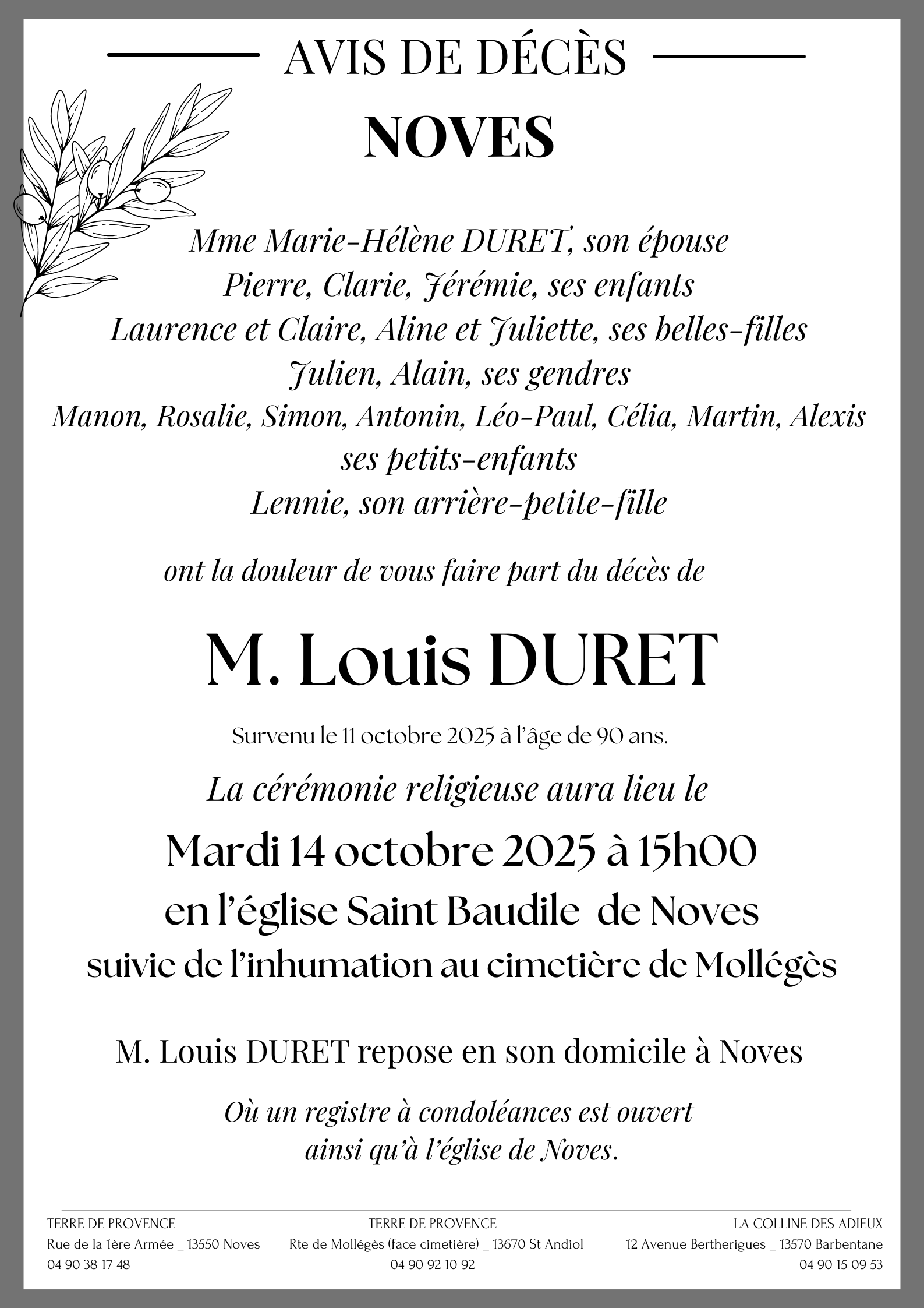 C’est avec une grande tristesse que nous vous annonçons le décès de Louis DURET survenu le samedi 11 octobre 2025 à Noves.