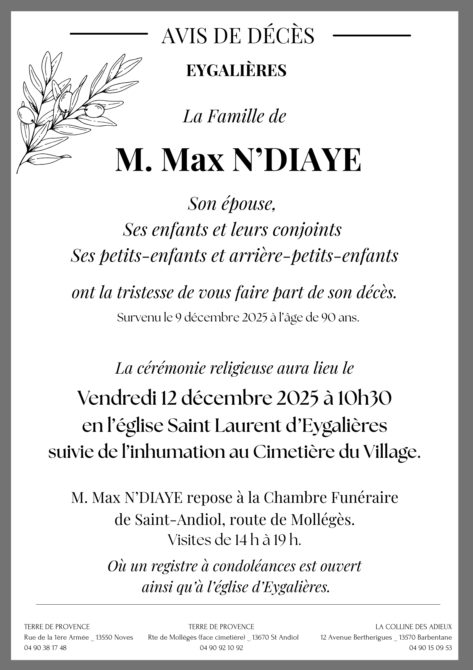 C’est avec une grande tristesse que nous vous annonçons le décès de Max N'DIAYE survenu le mardi 09 décembre 2025 à Cavaillon.