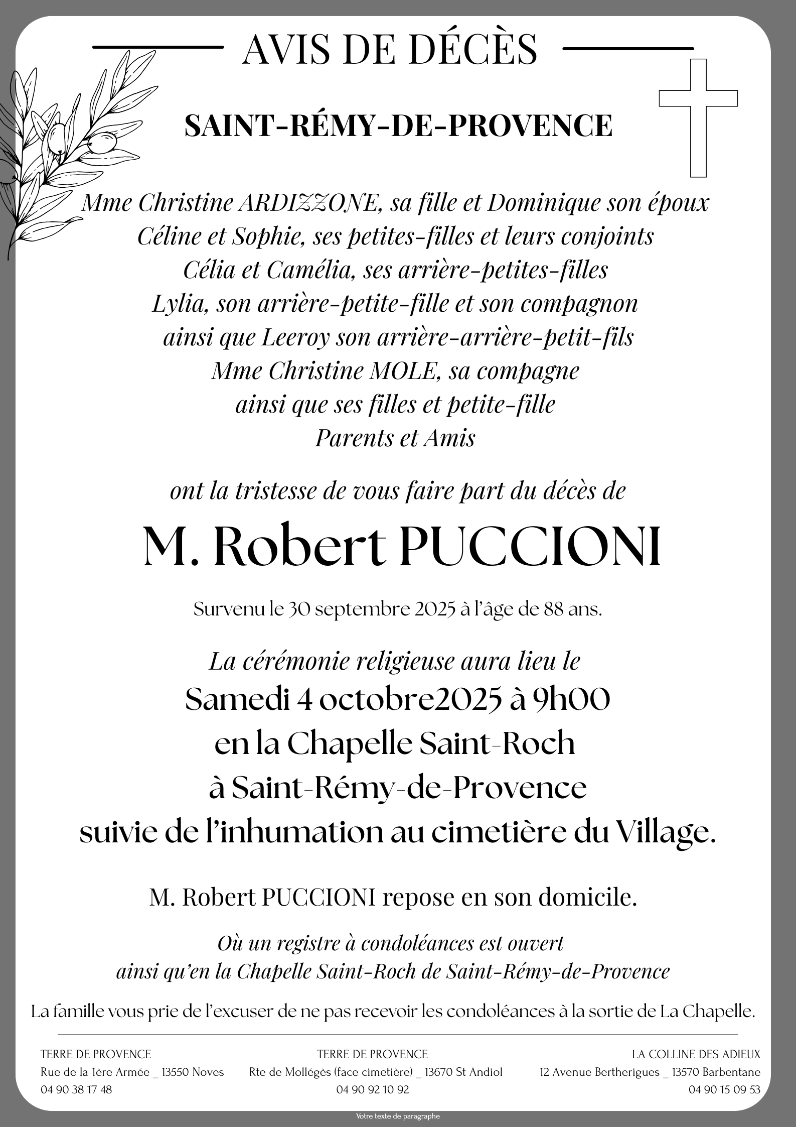 C’est avec une grande tristesse que nous vous annonçons le décès de Robert PUCCIONI survenu le mardi 30 septembre 2025 à Saint-Rémy-de-Provence.