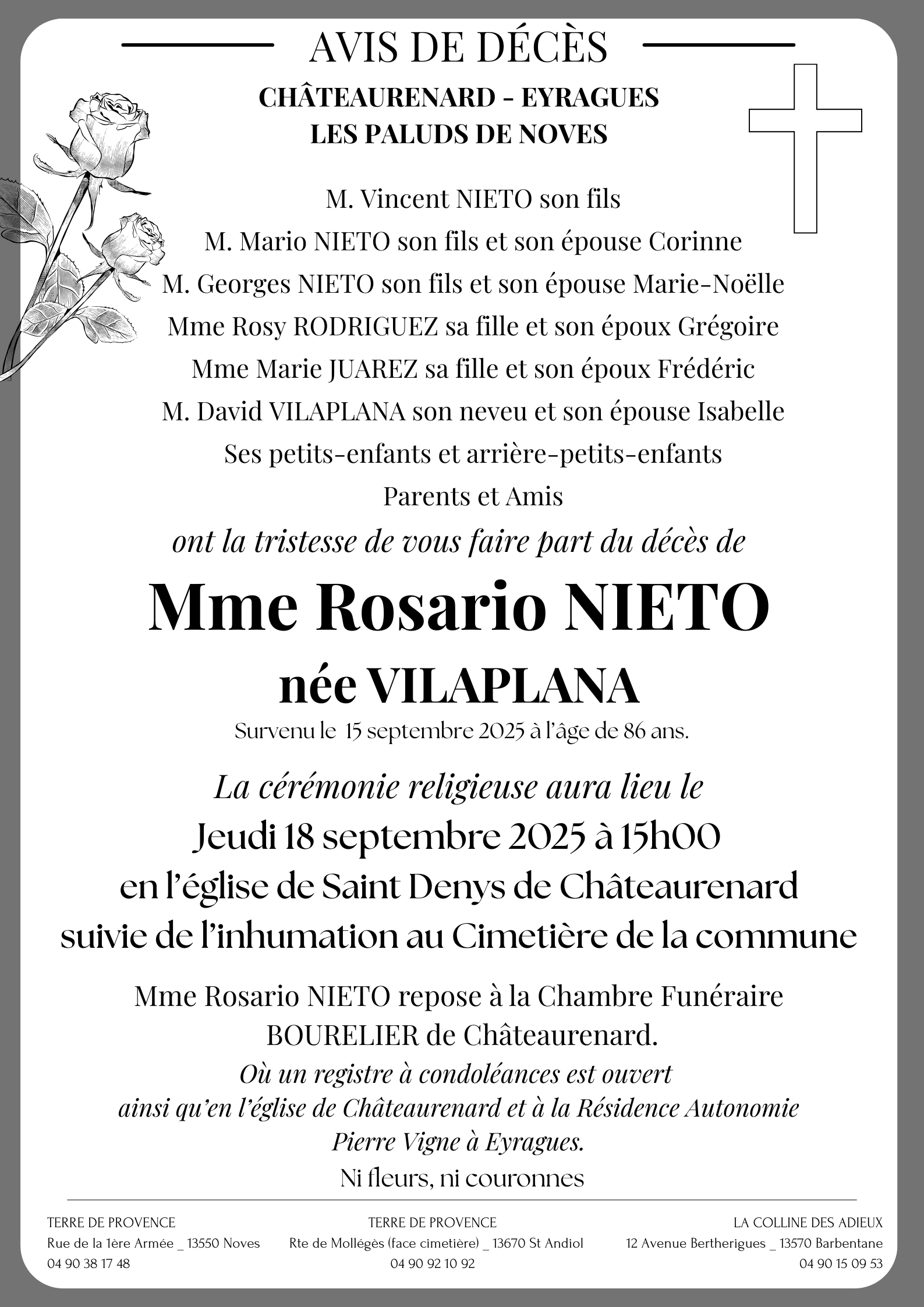C’est avec une grande tristesse que nous vous annonçons le décès de Rosario NIETO survenu le lundi 15 septembre 2025 à Avignon.