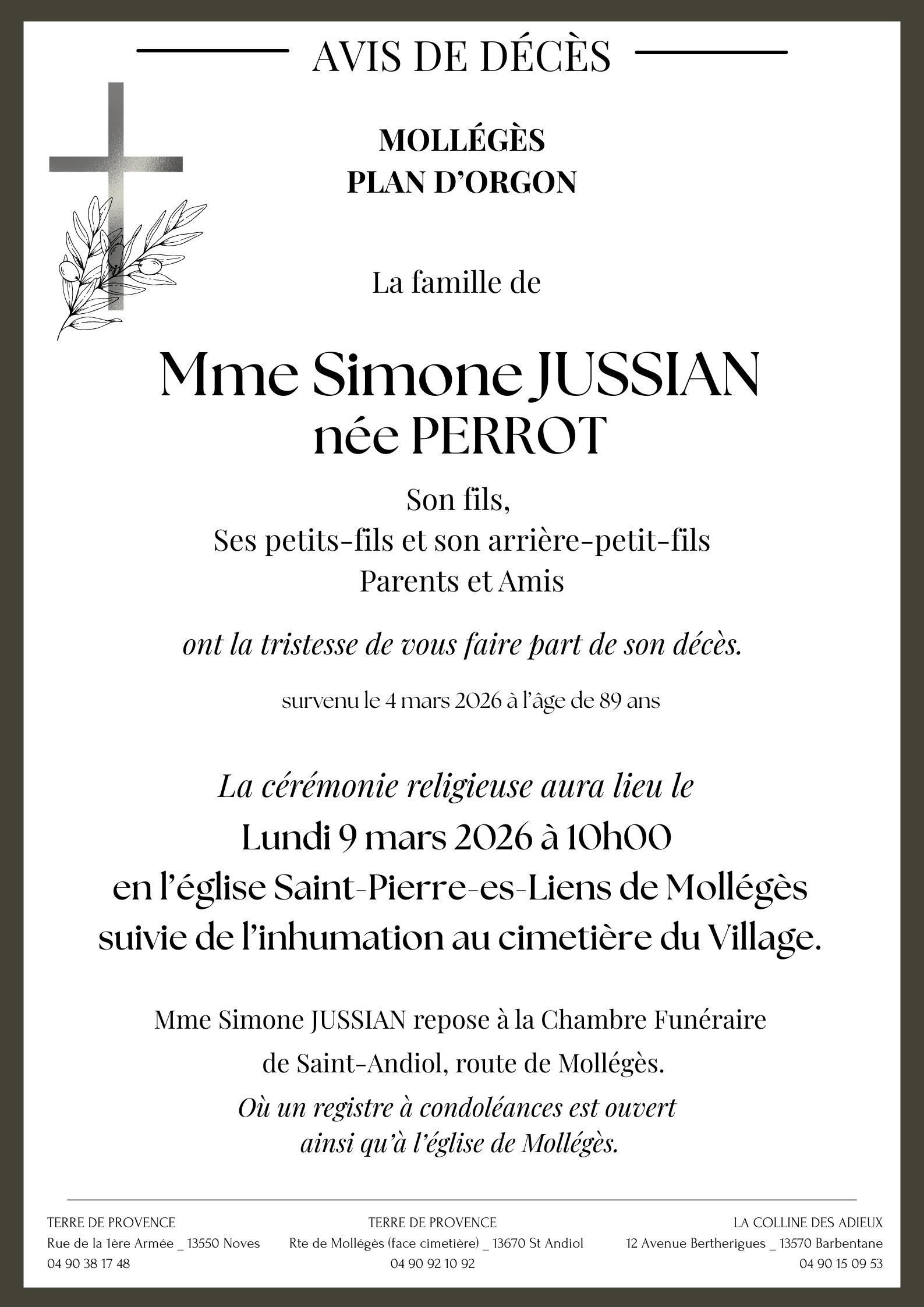 C’est avec une grande tristesse que nous vous annonçons le décès de Simone JUSSIAN survenu le mercredi 04 mars 2026 à Noves.